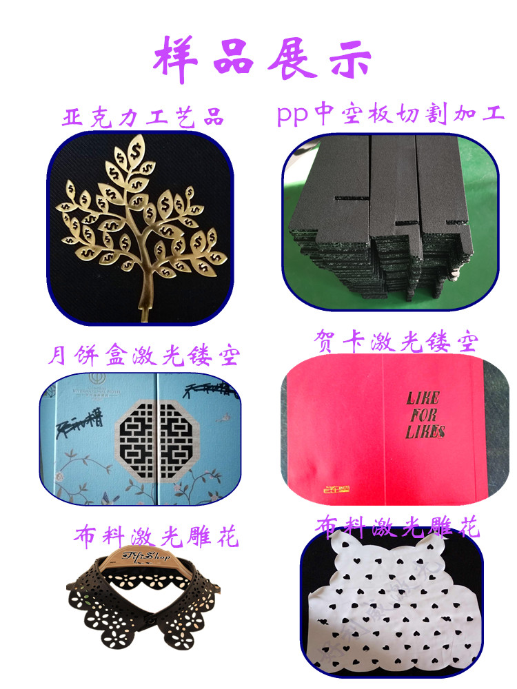 本公司專業(yè)對(duì)外加工布料切割加工、無(wú)紡布毛氈激光鏤空 皮革激光加工、服裝布料激光雕花、麂皮絨激光切割、亞克力,竹木盒月餅盒激光加工,皮革激光雕花等。激光沖孔切割不發(fā)黑不發(fā)黃不發(fā)臭無(wú)黑灰”受到眾多客戶認(rèn)可歡迎打樣咨詢。
